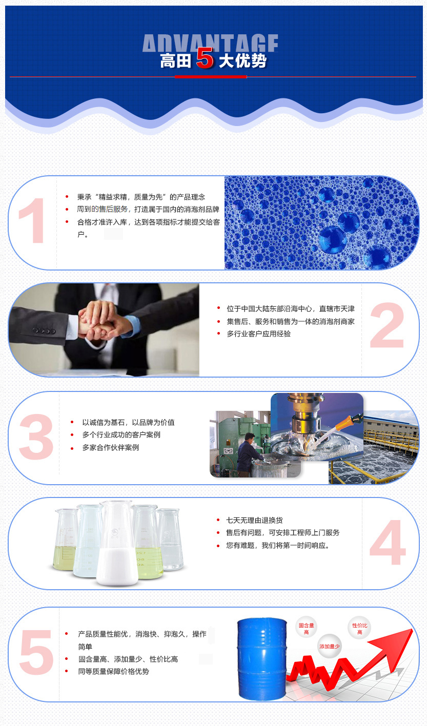 高田新材料有限公司针对造纸行业及其应用而开发的。它是由主要材料硅酮及其他特殊助剂复配而成,适应性强,适应PH值范围宽。消泡迅速,抑泡久。可用在高温、高酸碱度等条件比较苛刻的化学清洗中及化工反应中使用。